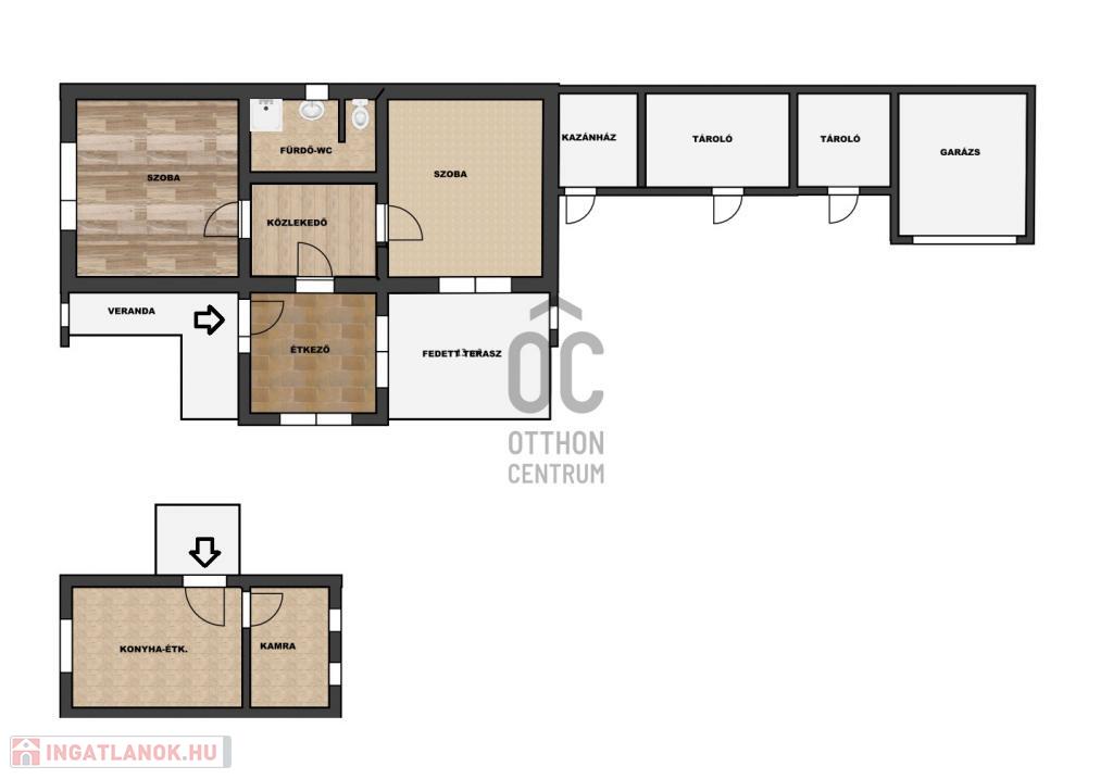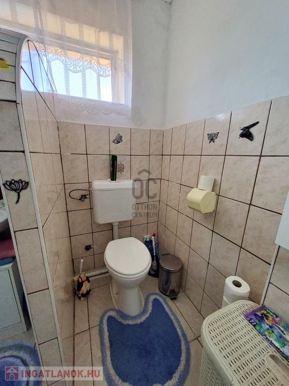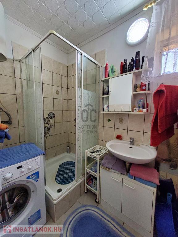 Szobák laminált és szőnyegpadlóval, többi helyiség járólap aljzat burkolattal van borítva. Melegvízet villanybojler adja.