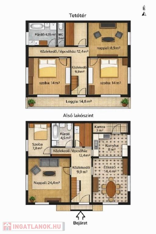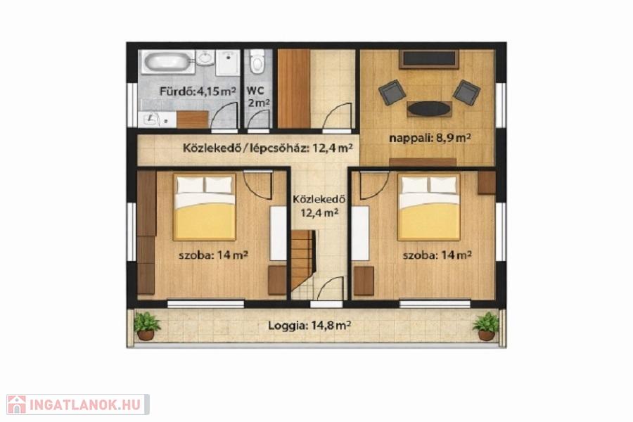 -tetőtéri szobák erkély kapcsolatosak, egy hatalmas 14,8m2-es loggiához kapcsolódik hozzájuk