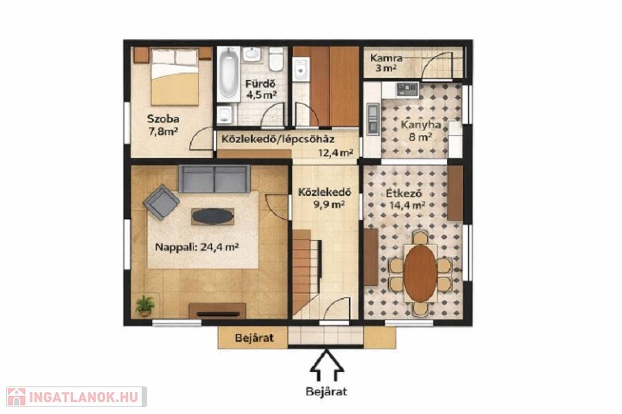 -két szintes lakótér, szintenként nettó:80m2, alatta garázs, kazánház és zöldségtároló található nettó:80m2