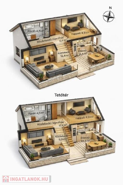 -dupla komfortos, mindkét lakószinten fürdő/wc külön helyiségben
