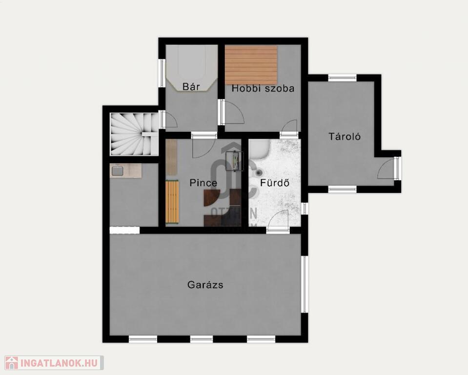 Pinceszint: garázs, tároló, fürdőszoba, hobbi szoba, szauna, bár/borozó