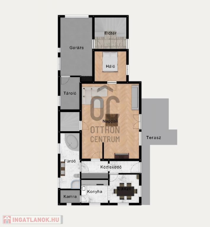 Földszint: 45 m²-es nappali teraszkapcsolattal, étkező, konyha, hálószoba, fürdőszoba, garázs, tároló