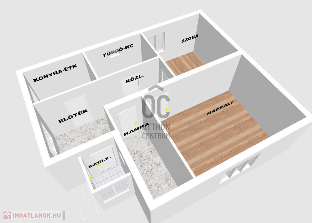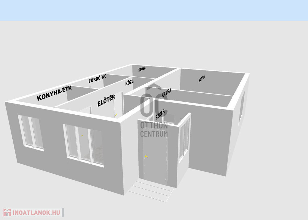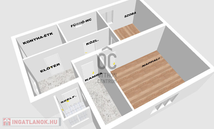 A két szobán kívül konyha-étkező, fürdőszoba-WC, kamra, előszoba, kazánház helységek lettek kialakítva.