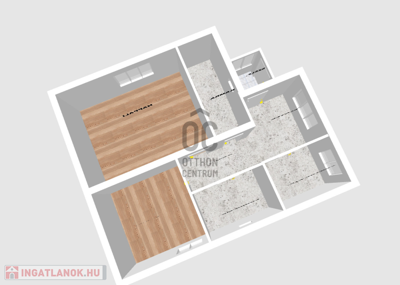 A két szobán kívül konyha-étkező, fürdőszoba-WC, kamra, előszoba, kazánház helységek lettek kialakítva.