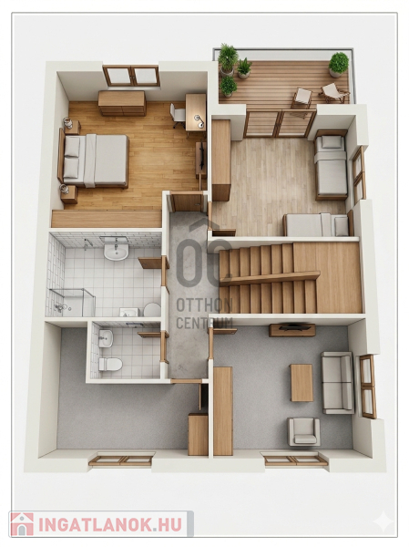 • 87,83 m² emelet: belső lépcsőházzal megközelíthető, 4 szoba, vizesblokk