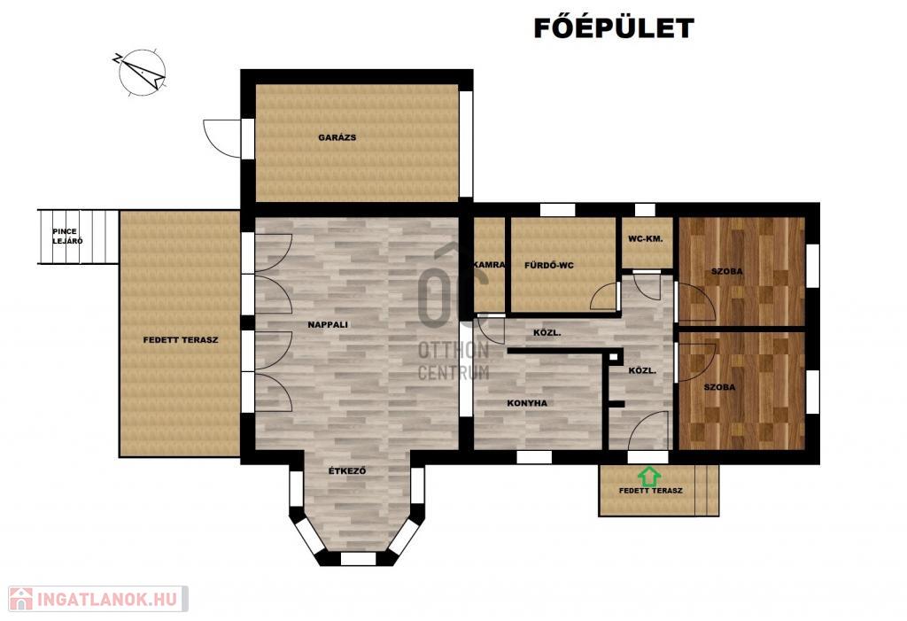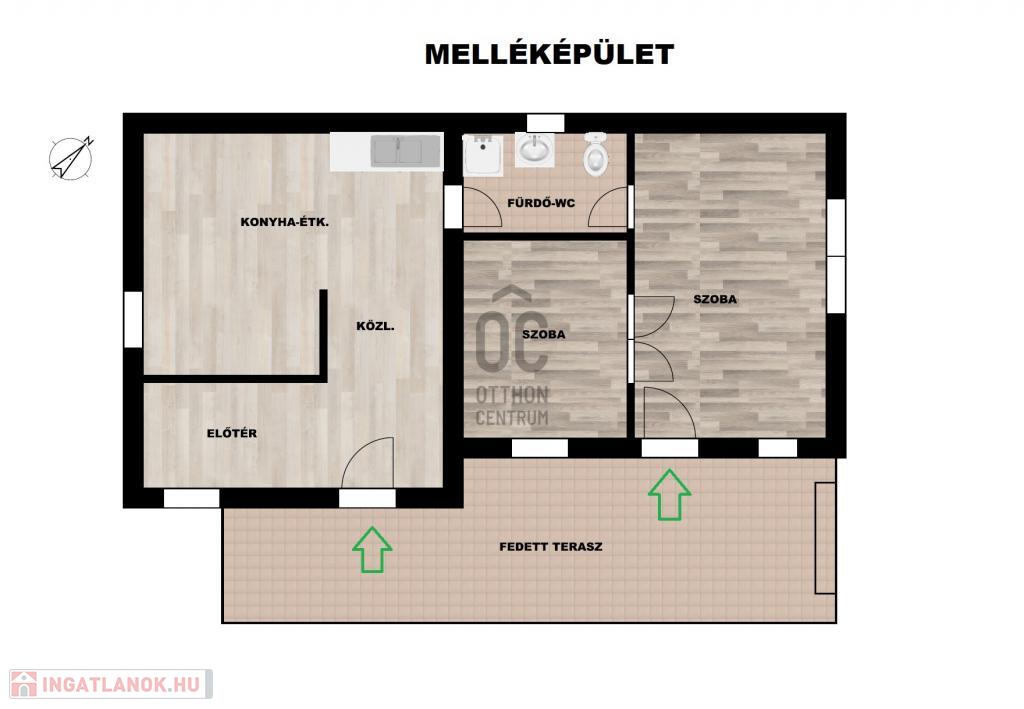 Nagy fedett terasz, 2 szoba, konyha-étkező, fürdőszoba épült egyidőben a főépülettel.