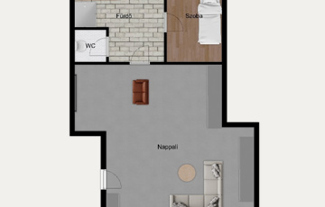 A földszinten tágas, egybenyitott nappali–étkező–konyha fogadja, mellette két hálószoba, külön fürdőszoba és WC. A fedett előtérből nyíló, jelenleg irodaként használt helyiség könnyedén átalakítható garázzsá vagy további szobává, de vállalkozási célokra is ideális.